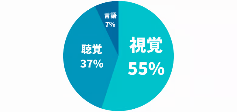 ちなみに、人間はコミュニケーションの際に、視覚情報55%、聴覚情報38%、言語情報7%の割合で影響を受けていると言われています。